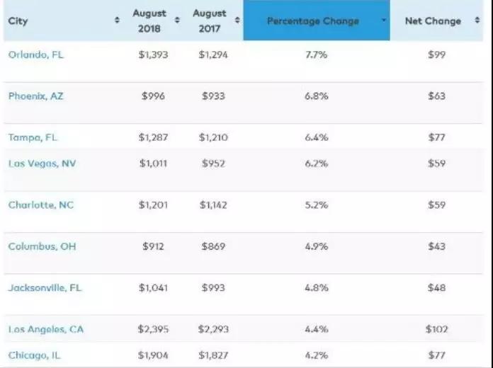 与买房的道理一样,地段好的房屋租金会更高,如果房产位于洛杉矶交通便利的市中心地带,房租的费用将有所上升,同时位于学区以及商业圈周围的房产,其房产面积越大,所需支付的房租就会越高,较上一年洛杉矶市中心的租金同比增长率达到了4.4%,从租金绝对值来看,洛杉矶较去年同期上涨 102 美元位居第一。