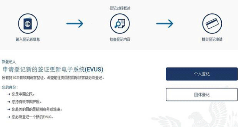 自2016年11月29日起,凡持中国护照、并有十年美国B1/B2、B1或B2签证者,都必须先通过登录EVUS网站登记,才能取得登机证入境美国。
