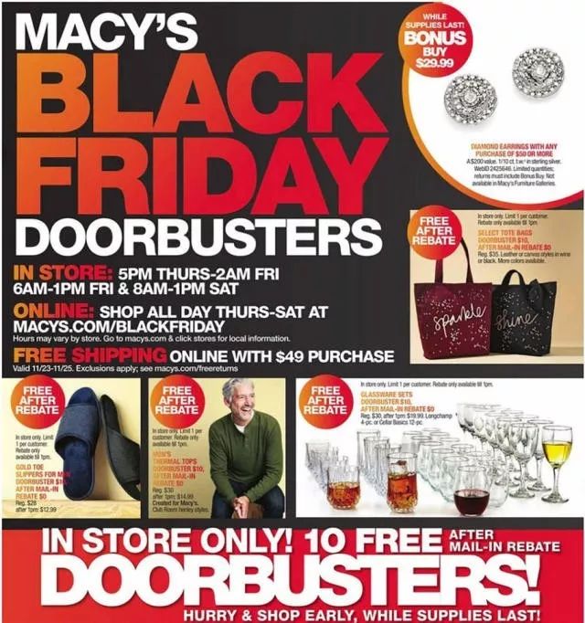 我们都见识过“双11购物节”带来的全民狂欢,但是以诱人折扣点燃节日热情并不是马云的首创。在消费文化的诞生地——美国纽约,每年11月的第四个星期四是传统的感恩节。而从感恩节后的第一天开始,便是历史悠久的感恩节购物潮,即黑色星期五。对于美国商家来说是个大日子,因为这一天标志着圣诞采购季节的正式开始,是每年零售业圣诞销售业绩的晴雨表。届时,各家品牌都会互相“攀比”折扣力度,折扣券漫天飞舞,恨不能来一场“亏本清仓大甩卖”!