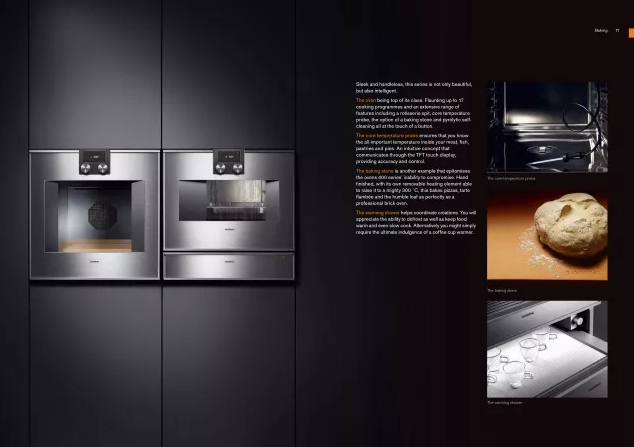 Gaggenau嘉格纳为您呈现全新的烤箱系列,烤箱控制显示屏内嵌于烤箱门体上,开创了外观设计的先河,并带来超大的内部空间。烤箱门体与箱体等高,可以180°开启;四层远红外涂层的钢化玻璃材质、不锈钢或铝合金内衬,兼顾隔热、美观与耐用。另设有高温分解自动清洁系统、食物中心温度检测棒、电转烤肉架和可选择的烘焙石,能满足各种需要,力求每一道烹饪都精到无比。