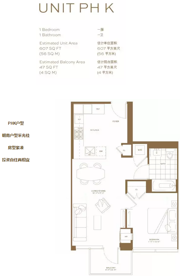 PHK户型紧凑,经典方正户型。厨卫俱备,还附有一方阳台,是理想的独居小窝。配备高档MIELE厨房电器。即使独居,也不能在饮食起居的精致之上妥协。