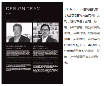 主席Jean- Gabriel Neukomm超过20年的职业生涯一直引领着他与许多引人关注的项目顾客合作,例如Calvin Klein和酒店企业家Ian Schrager。近期该企业不仅开发了奢华住宅项目,还与知名开发商合作参于了大规模的城市项目,例如GreenlandUSA、F&T Group、Gotham及Rockrose开发商。